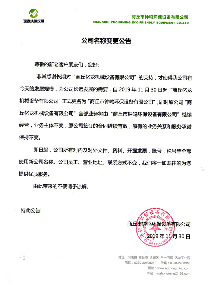 即日起,商丘億龍正式更名為鐘鳴環(huán)保設(shè)備,具體請查看更名公告。